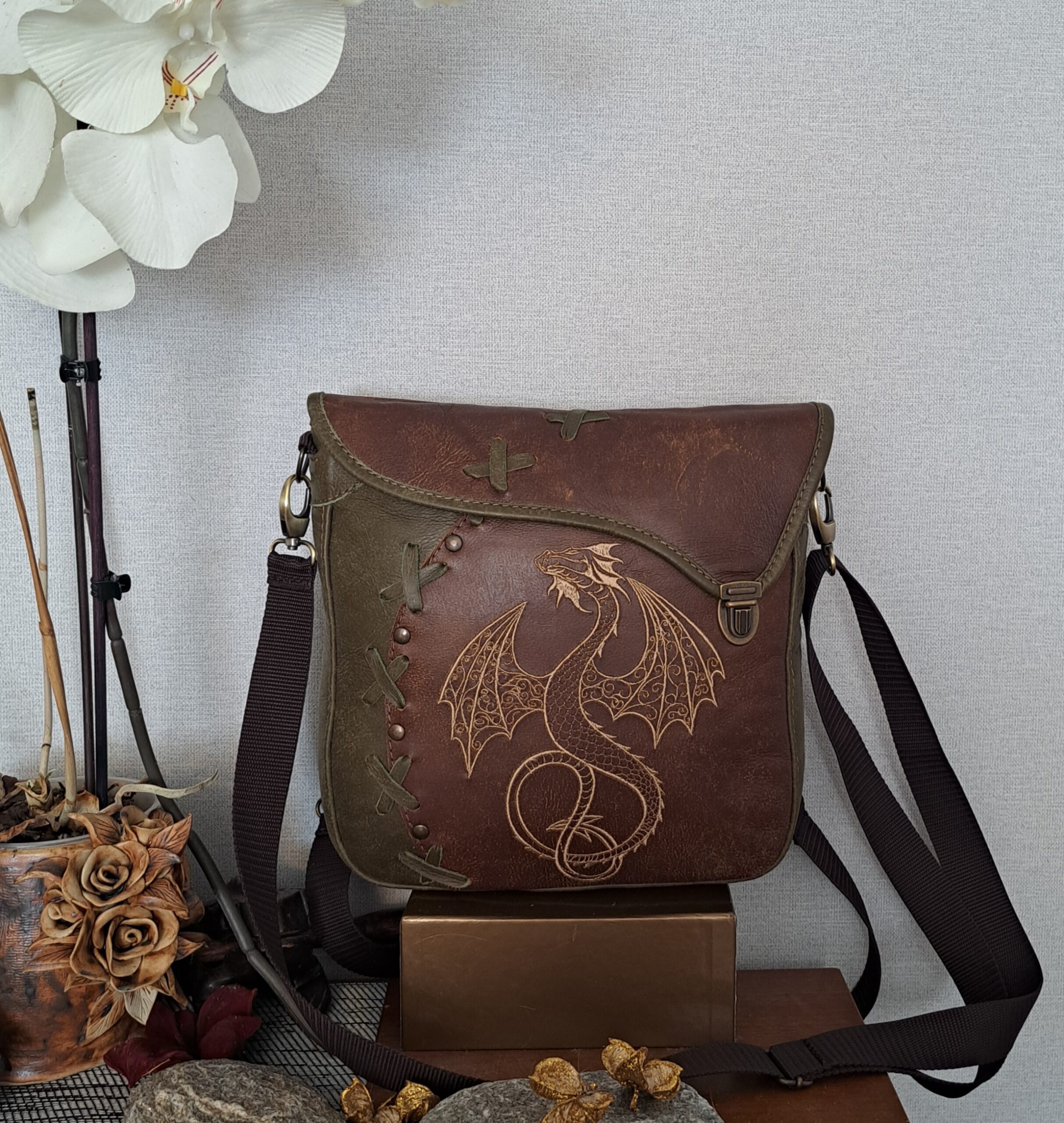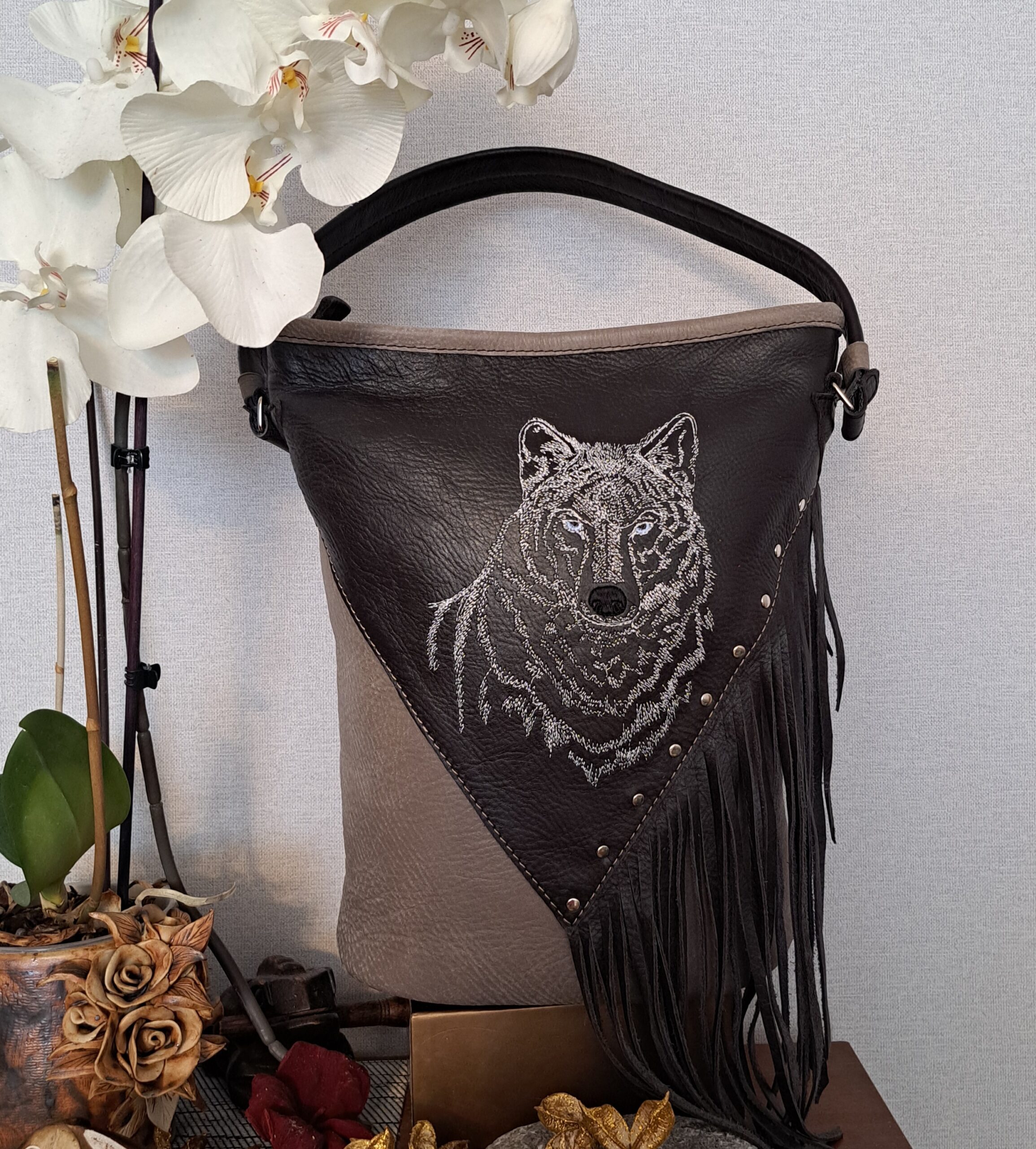 Naturaalnahast shamanistlik õlakott eriliste tikanditega. Kõik kotid on valminud käsitööna ning on kantavad nii õlakoti kui ka seljakotina. Kvaliteetsed lukud ning õmblused annavad luksusliku noodi ning lisataskud ja disainelemendid rikastavad toodet veelgi.